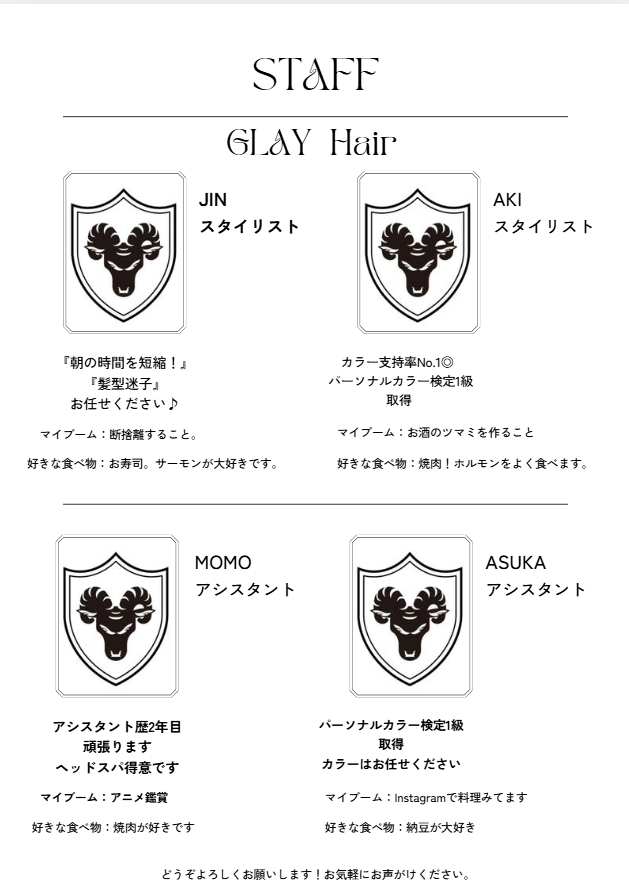 コンセプト GLAY 南手城店では、白でも黒でもない“グレー”のように、決めつけない美しさを大切にする美容室です。トレンドに流されすぎず、個性に縛られすぎない。お客様一人ひとりのライフスタイル、空気感、その人だけが持つ「ちょうどいいバランス」を見極め、自然体で洗練されたスタイルをご提案します。髪型は、日常を少し前向きにしてくれるもの。GLAYは、飾りすぎないのに印象に残る、“さりげなく自分らしい美しさ”を引き出す存在であり続けます。 こんな髪のお悩みありませんか? ☑️自分に似合う髪型が分からない☑️美容室では良いのに、家だと再現できない☑️広がり、うねり、パサつきが気になる☑️カラーをしてもすぐに色が抜ける☑️何となく今の髪型にしっくりきていない☑️「変えたいけど、どう変えたらいいか分からない」 お客様の声 「今まで何となく流行で髪型を決めていましたが、ここでは“私に似合うか”をちゃんと考えてくれました。仕上がりが自然なのに垢抜けていて、職場でも褒められることが増えました。」 20代女性 「大きく変えたいわけじゃないけど、今の自分にしっくりこない…そんな気持ちを汲み取ってくれる美容室でした。セットも簡単で、毎朝のストレスが減りました。」 20代女性 「年齢とともに髪質やボリュームの悩みが出てきましたが、無理に若く見せるのではなく、今の自分に合うスタイルを提案してくれたのが嬉しかったです。安心して長く通える美容室だと思います。」 30代女性 よくあるご質問 Q. 自分に似合う髪型が分からなくても大丈夫ですか? A. はい、大丈夫です。GLAYではカウンセリングを大切にしており、ライフスタイルや雰囲気をもとに、無理のない「今のあなたに合うスタイル」をご提案します。 Q. スタイリングが苦手でも扱いやすい髪型にしてもらえますか? A. 可能です。ご自宅での再現性を重視してカット・デザインを行っていますので、毎日のセットが簡単になるよう仕上げます。 Q. 大きくイメージを変えたくないのですが相談できますか? A. もちろんです。GLAYではやりすぎない変化を大切にしています。今の良さを活かしながら、さりげなく印象が良くなるスタイルをご提案します。 メニュー・料金表 カット・・・5700円パーマエステ・・・21000円ストレートエステ・・・23000円 トリートメントエステ・・・12000円カラーエステ・・・15000円 WEB予約はこちらから(084-999-5523) アクセス 店舗名:GLAY hair the total beauty 福山南手城店営業時間:9:00~17:00TEL:084-999-5523住所: 広島県福山市南手城町3丁目2−1−3最寄駅:東福山駅(徒歩30分)駐車場:パーキングをご利用ください